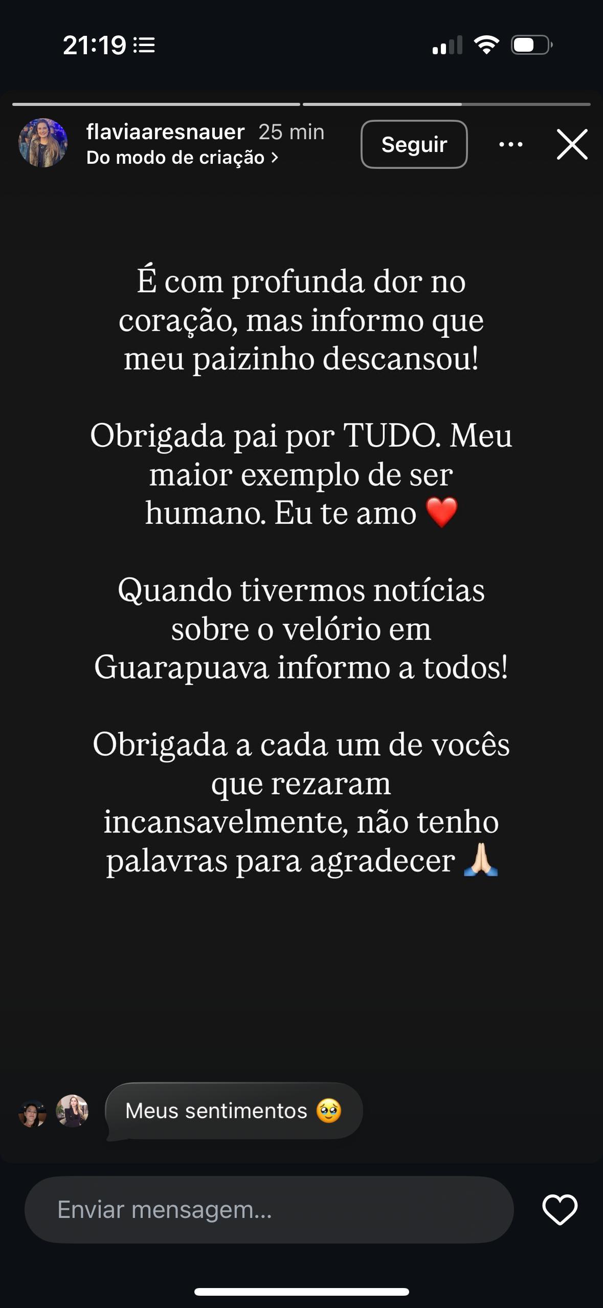 Em comunicado por rede social, Flávia escreveu: "É com profunda dor que meu paizinho descansou!"