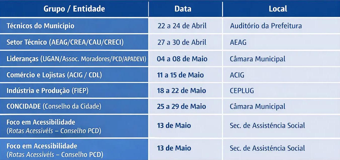O cronograma agora foca nas reuniões setoriais. Esses encontros são fundamentais para ouvir segmentos específicos da sociedade, garantindo que áreas como habitação, acessibilidade, comércio, indústria e infraestrutura técnica sejam debatidas por quem vive o dia a dia desses setores.