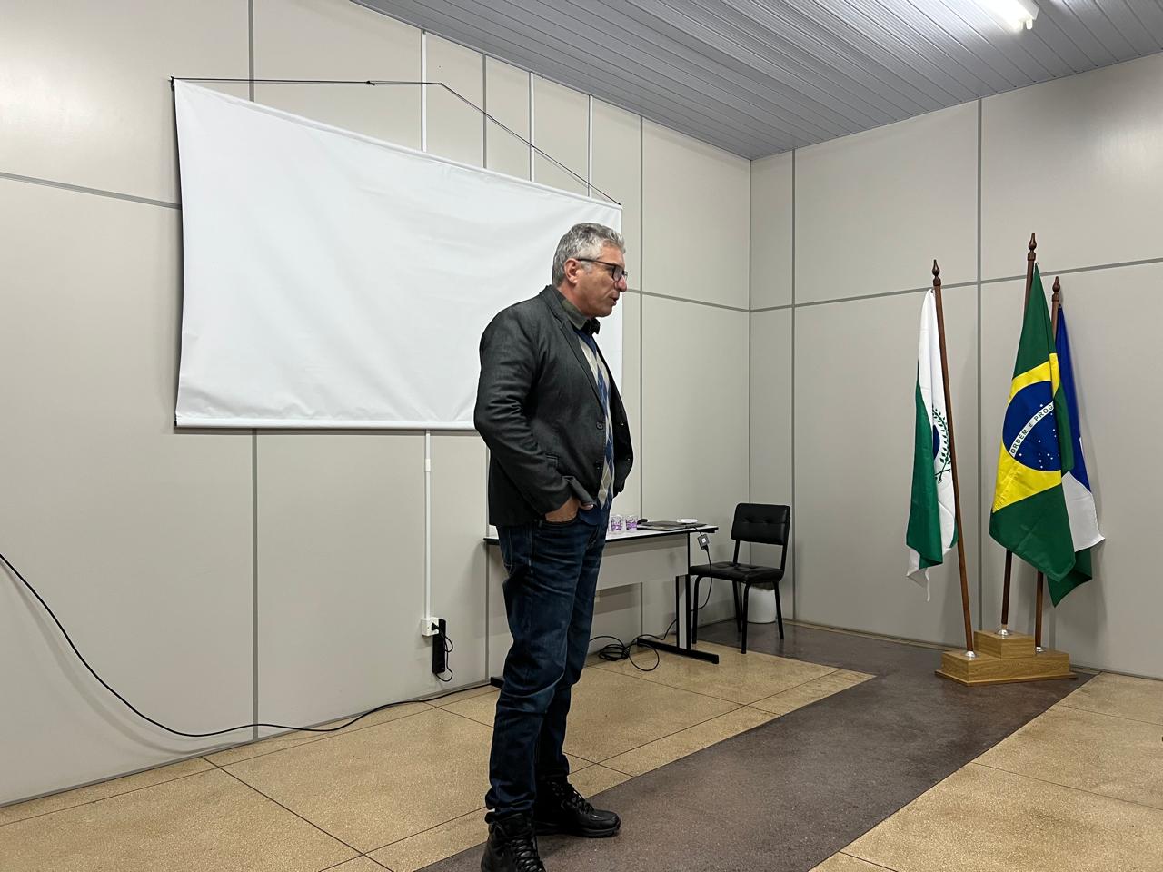 Secretário municipal de Trânsito, Péricles de Matos (no alto), na reunião com técnicos e representantes dos motoboys: “Precisamos desenvolver uma mentalidade de segurança, de obediência às leis e de valorização da vida”