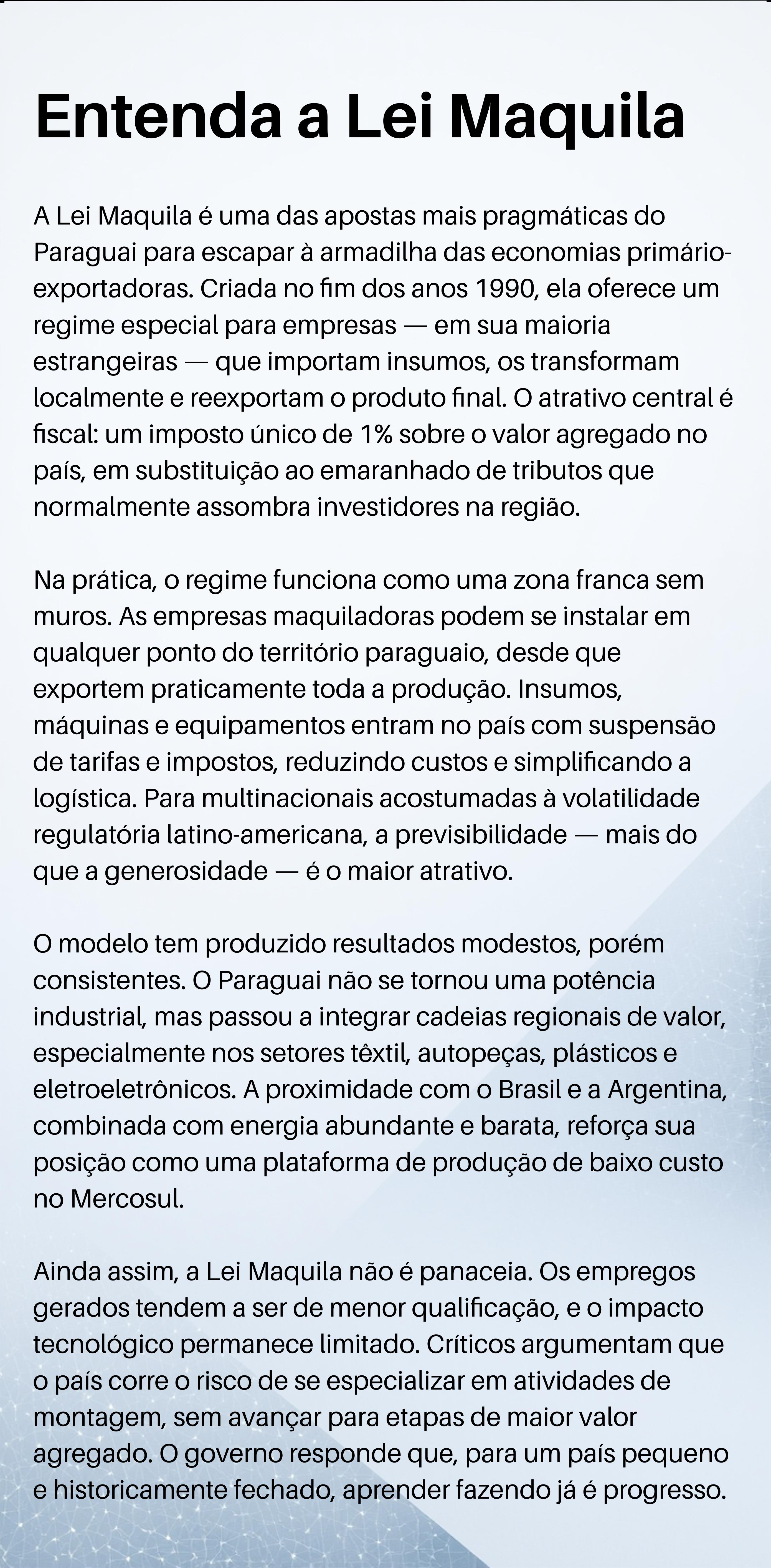 Notadamente, cerca de 63% das exportações Maquila têm como destino o Brasil, refletindo o papel do Paraguai como extensão produtiva da cadeia industrial brasileira.