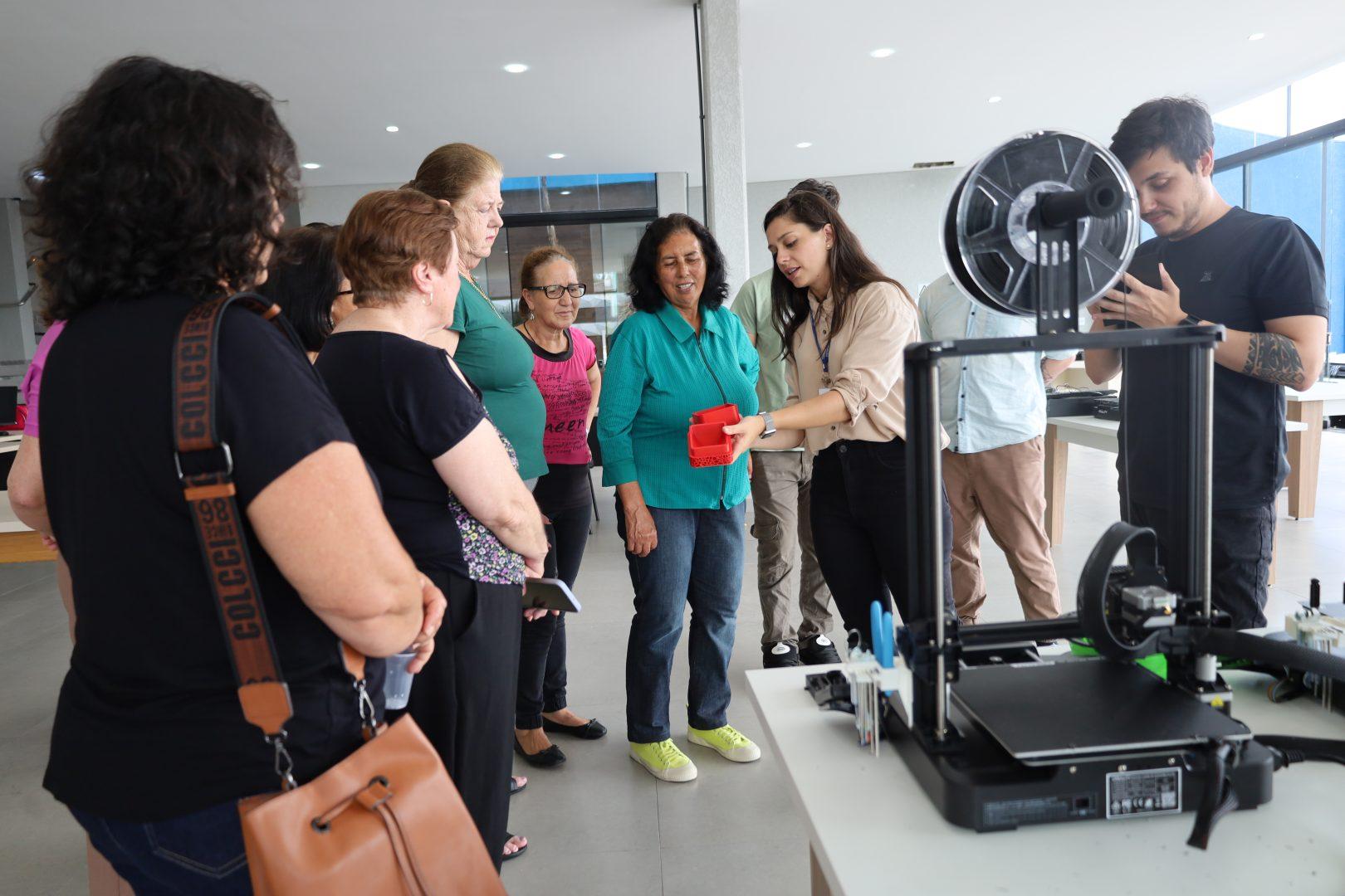 A programação iniciou com um tour guiado pelos espaços da secretaria. As participantes conheceram o ambiente de coworking, voltado ao desenvolvimento de projetos, além das impressoras 3D e demais estruturas que compõem o ecossistema municipal de inovação. O objetivo foi apresentar, de forma acessível, como a tecnologia está presente no dia a dia e como pode contribuir para facilitar tarefas, gerar novas oportunidades e estimular a criatividade.